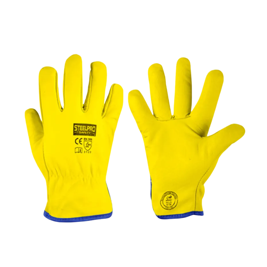 Material en cuero bovino de color amarillo y blanco con puño de seguridad